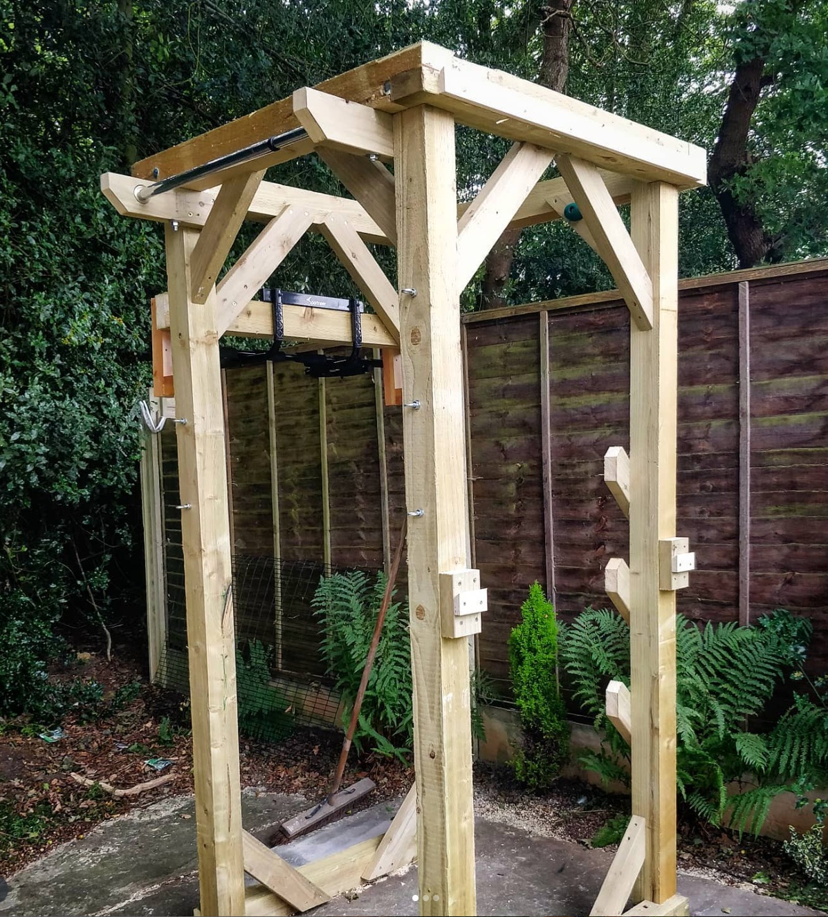 Getting inspiration from Pinterest I built what is known as a power cage, I built it from 4×4 fence posts and incorporated racks for a barbell and loops for resistance bands, it even had a bar for pull ups, I capitalised on people going back to the gym and selling the weights they bought during lock down.