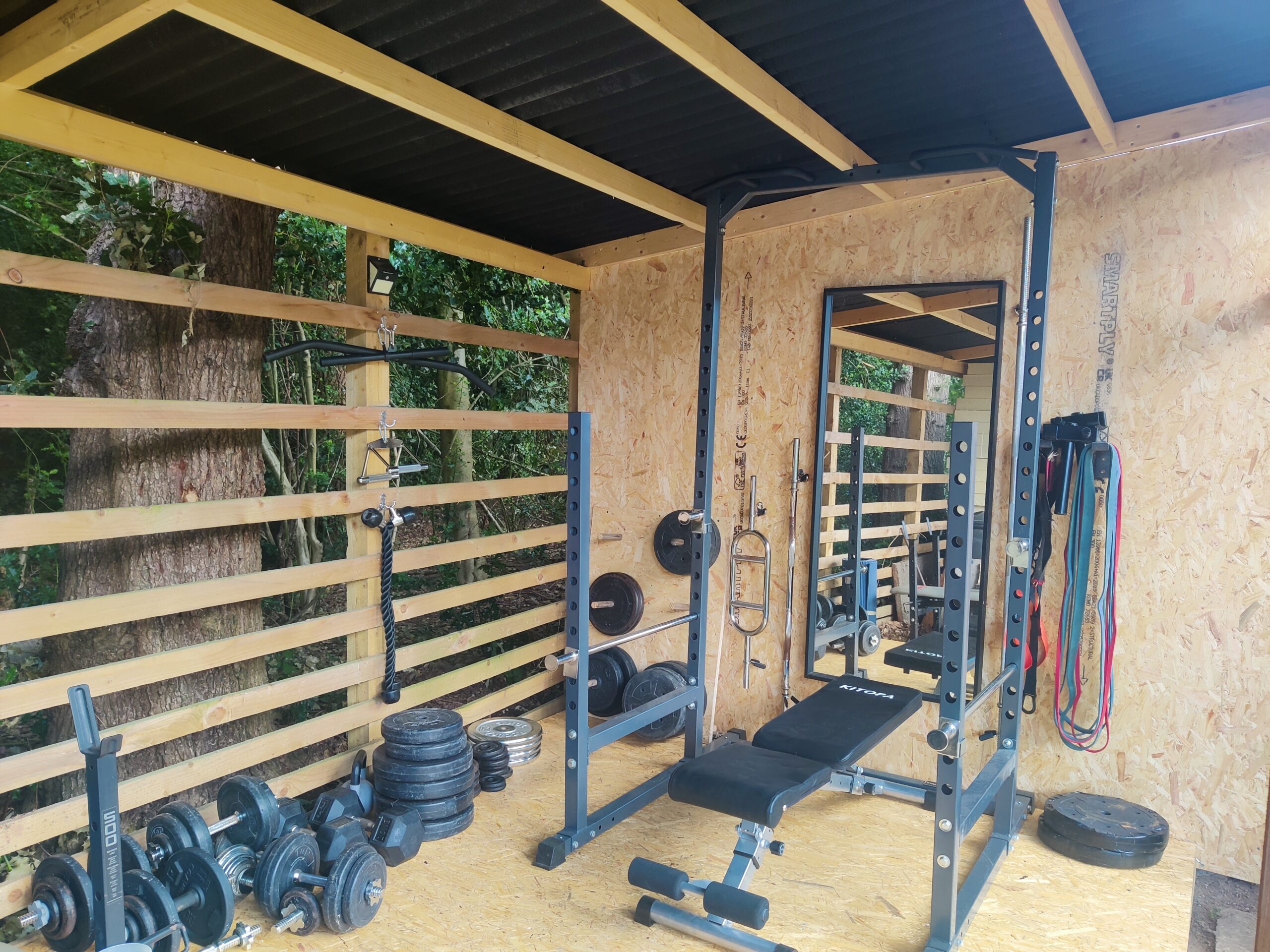You’ve probably heard of Muscle Beach…. Well, this was Muscle Forest TM! My own gym down the garden under the trees! Perfect… Except when it rained… I needed a better solution. Along came Muscle Forest TM Mk 2! A fully covered fitness suite. The main gym has all the equipment I need to not only maintain but build my strength and fitness with squat rack, bench press, pull up bars, dip bars, dumb and bar bells and even a cable machine. I’m very proud of it and I am open for membership. You will have to sign a disclaimer to say you don’t mind being cold in winter and bit to death by bugs in summer!