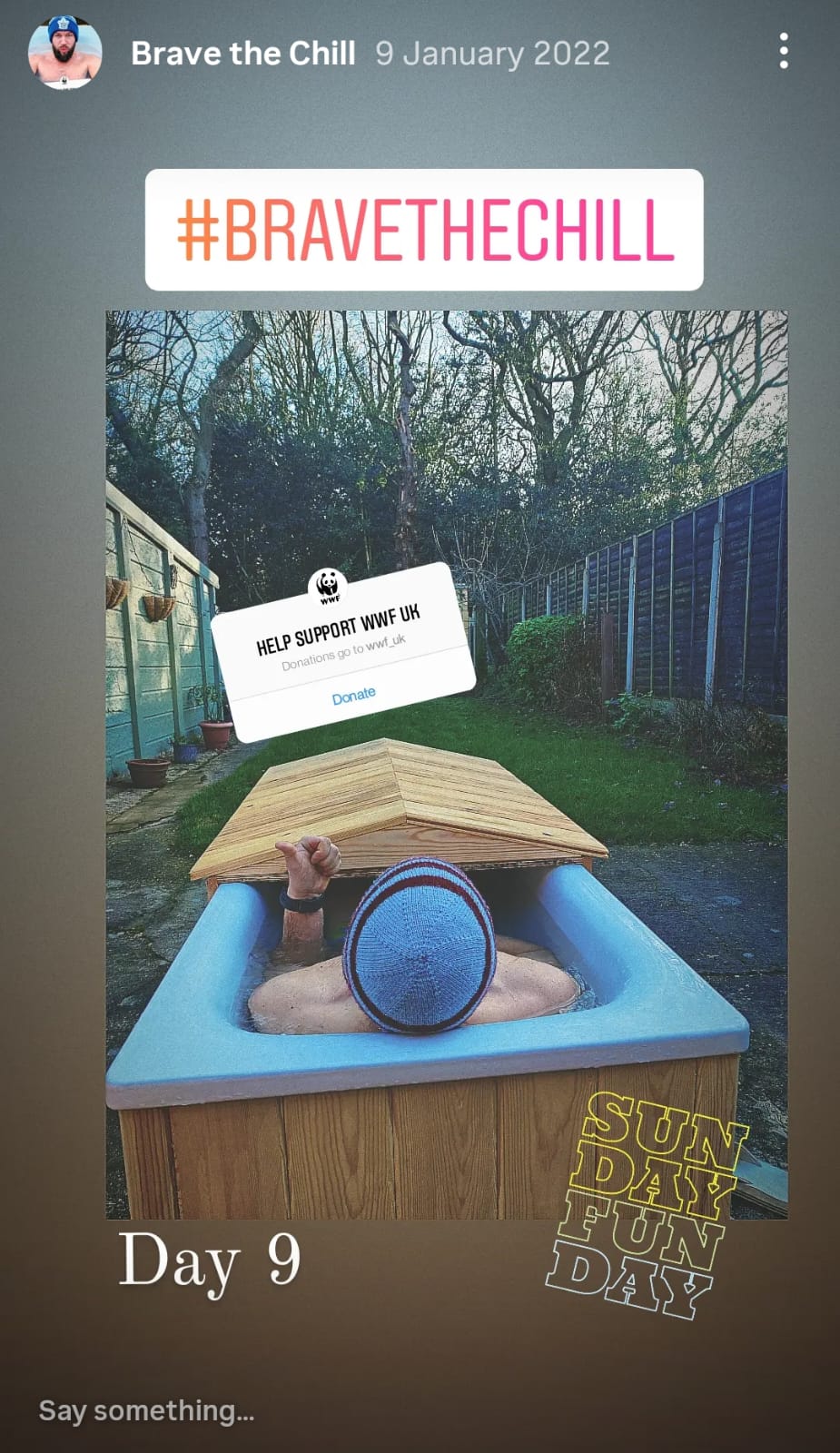 As mentioned in the previous blog I was spurred on by the influential writings of The Ice Man, Wim Hoff, and to help keep me motivated I would be raising some money for charity… So, I signed up to Brave the Chill for WWF. The brief being get some cold exposure of some sort, so my promise of a cold plunge of a minimum of 2 minutes every day was potentially more extreme than what most had planned, but then that was the whole idea of the Year of Challenges, it needed to be a challenge!